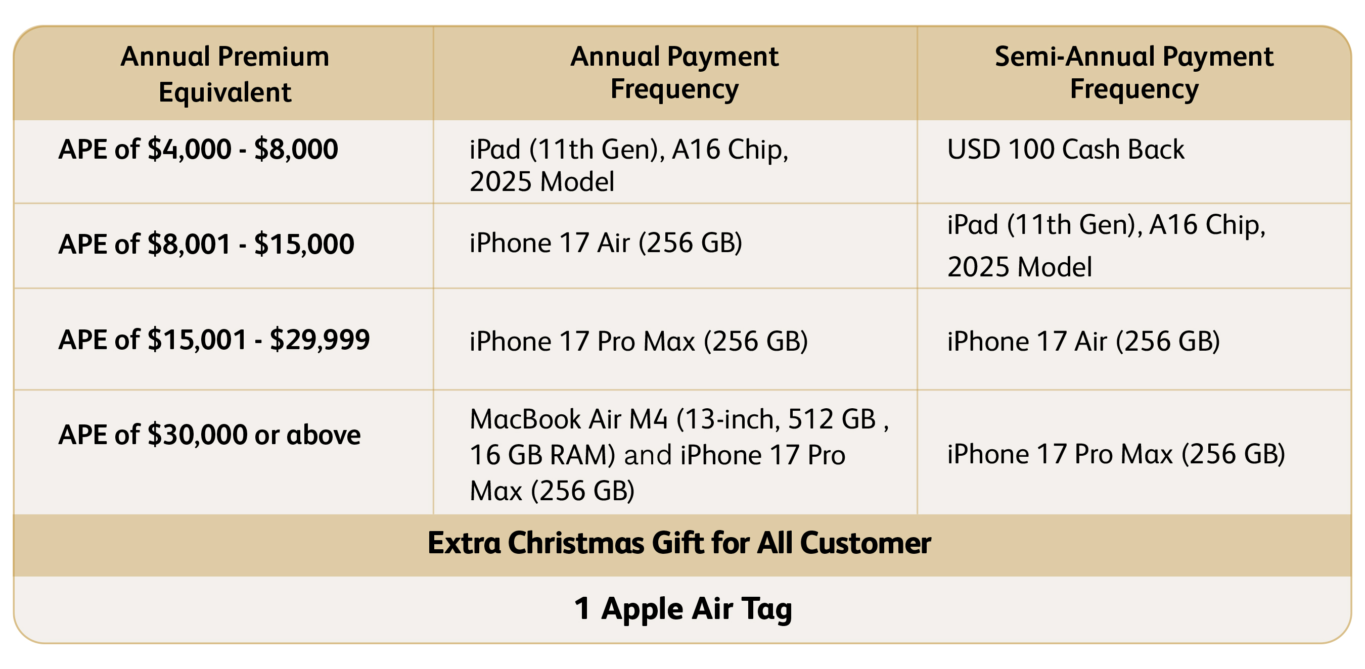 - The promotion is eligible for the new policy issued from 1 - 31 December 2025 with the annual premium equivalent (APE) of $4,000 or above.