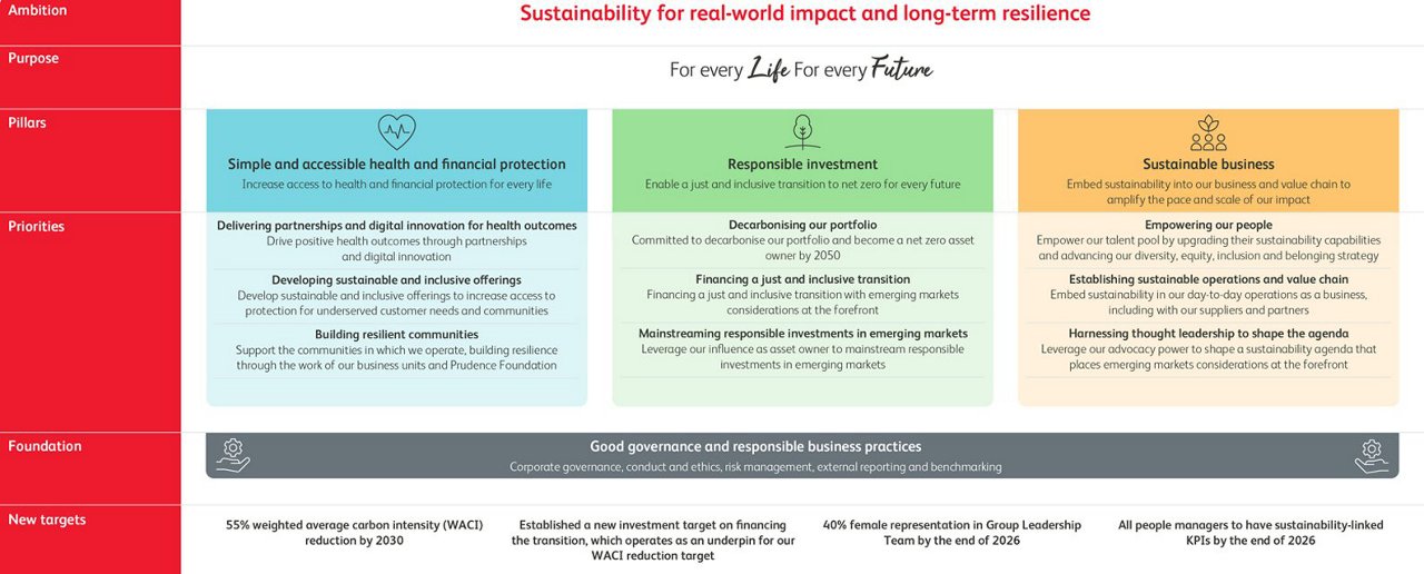 The evolution of our sustainable journey is in line with our mission to be the most trusted partner and protector for this generation and generations to come by providing simple and accessible financial and health solutions. Our sustainability strategy reflects our business purpose and leverages the business strengths to  create long-term value for society and our stakeholders. Our footprint across Asia and Africa enables us to protect 4 billion people in the markets that will determine the future and wellbeing of our planet and our societies.